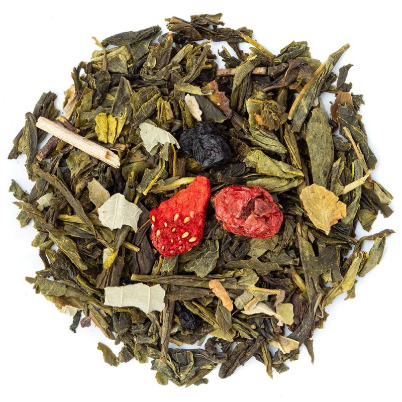 The organic green tea Wild Berries is rich in red fruits, including strawberry slices, elderberries, blackberries, and red currants.
