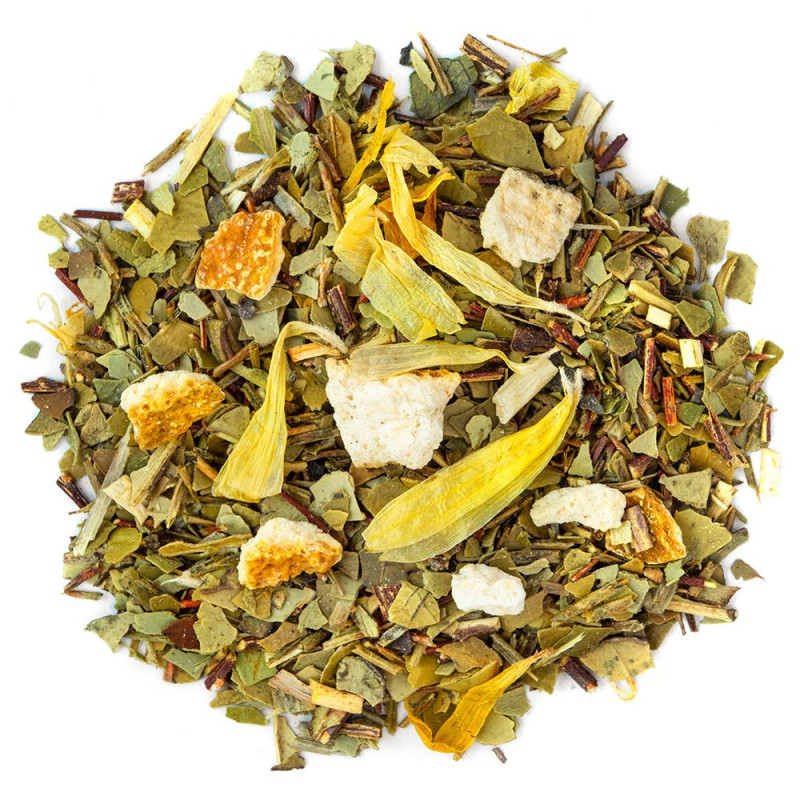 Con la sua caffeina, il nostro mate verde bio all'arancia possiede effetti detox. Ma i suoi benefici per la salute non si fermano qui. Il mate verde bio produce un effetto stimolante ideale per lottare contro la stanchezza. Secondo il parere degli erboristi, il mate verde bio favorisce la digestione e riduce i dolori. Nel nostro infuso, è accompagnato da rooibos verde, rinomato per lottare contro i disturbi gastro-intestinali. La tisana detox comporta anche bei pezzi di scorza d'arancia. Con i suoi flavonoidi, la scorza d'arancia sostiene la salute cardiovascolare grazie ai suoi effetti ipotensivi. I suoi oli essenziali sono, inoltre, vettori di tranquillità fisica e mentale. Per questa tisana, abbiamo aggiunto fiori di calendula che stimolano il sistema immunitario e calmano le infiammazioni.