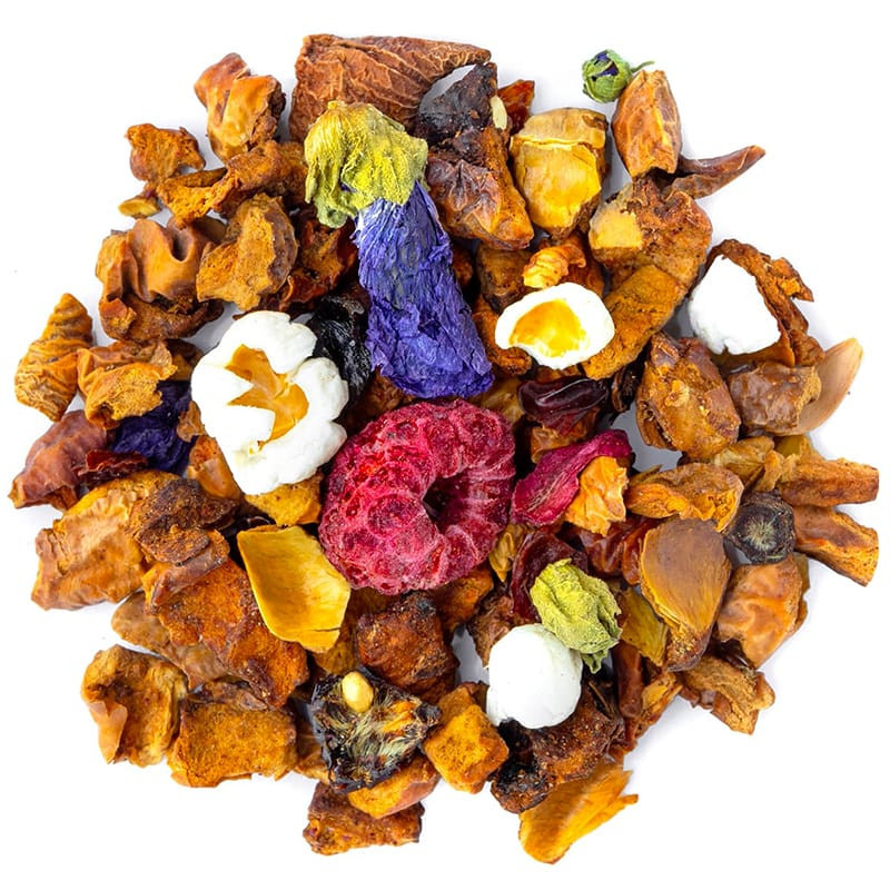 Veri pezzi di frutta secca, piante intere e tè di origine accuratamente selezionati.