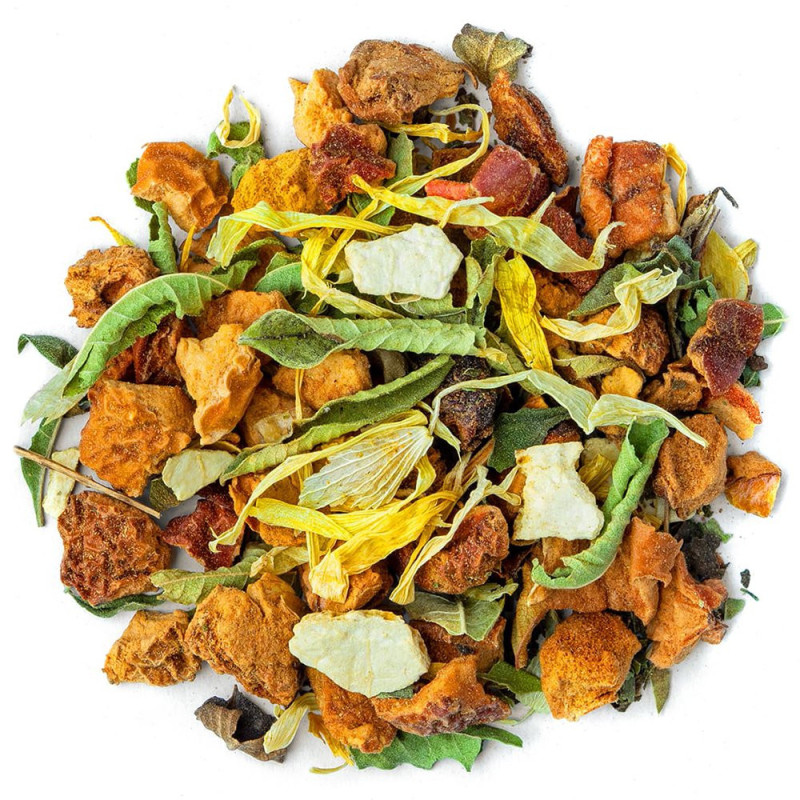 Con la sua miscela naturale di piante e frutti, l'infuso verbena arancia è dolce al palato e potente per la salute. Il sapore dolce della mela, associato al profumo di scorze d'arancia, apporta una nota fruttata. Leggermente citrate, la verbena e la melissa sviluppano il lato rinfrescante della bevanda. Seguono poi le piante da erboristeria come il luppolo, il tulsi (foglie di basilico sacro) e la santoreggia che donano una nota vegetale a queste bevande. In questa ricetta sottile, potete aggiungere una nota di limone per esaltare il lato fresco o optare per un po' di rooibos dal profumo più caldo, apprezzato a fine giornata.