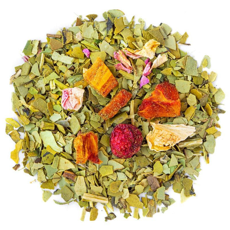 Un délicieux mélange qui allie à la fois les vertus du maté au bon goût des fruits rouges. On retrouve dans ce mélange de la grenade, des groseilles, de la papaye, des fraises et bien sûr du maté vert. Les fruits présents dans cette délicieuse composition viennent adoucir le côté amer du maté. Le maté, qui est originaire d'Afrique du Sud, est une boisson énergisante, qu'il est donc déconseillé de consommer le soir.
