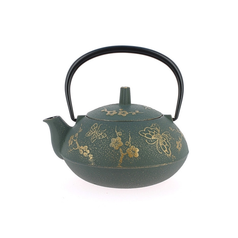 De Japanse Gietijzeren Theepot Iwashu Vlinder Brons wordt met zorg vervaardigd door de ambachtslieden van Iwachu. Het unieke ontwerp toont gouden of zilveren vlinders die lijken te dansen tussen de bloemen op een groenbruine of zwarte achtergrond, wat een vleugje poëzie toevoegt aan uw theeritueel.