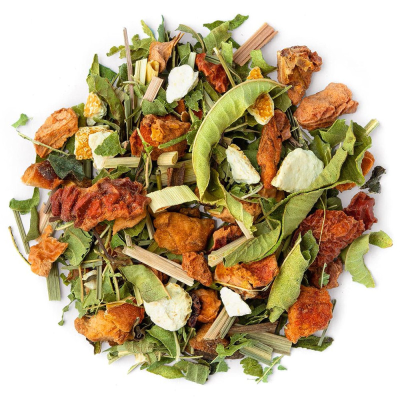 Ontdek onze kruidenthee Brume d'Oranger, een ideale infusie voor wie op zoek is naar een verfrissende en kalmerende drank. Naast de smaak van oranjebloesem bestaat deze kruidenthee uit appel, hele verveine, citroengras, sinaasappelschillen, kaneelstokjes en natuurlijk sinaasappelaroma. De smaak van deze kruidenthee is zowel zoet als fris, met tonen van sinaasappel en oranjebloesem. Het is een ideale drank om te ontspannen na een lange dag, of om een moment van lezen of meditatie te vergezellen.