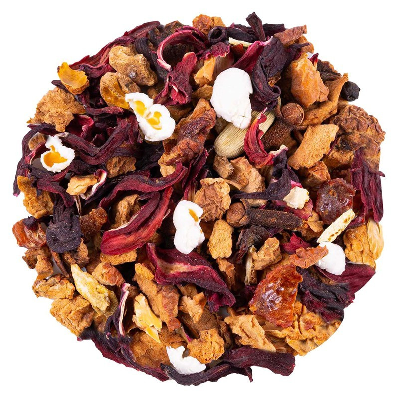 Samengesteld uit keukenspecerijen met krachtige smaak zoals kaneelschors, gember en kruidnagel, verwent deze kruidenthee uw smaakpapillen. De roosblaadjes, appel, sinaasappelschil en hibiscus brengen een zachte en zoete smaak. Vervolgens komt de citroensmaak van kardemom, werkelijk gekruid met een vleugje zwarte peper. Afkomstig van de traditionele geneeskrachtige recepten uit China, bekend in de kruidengeneeskunde, warmt deze biologische kruidenthee uw lichaam op. De stukken kruiden en specerijen leveren zowel een diepe smaak als meerdere gezondheidsvoordelen.