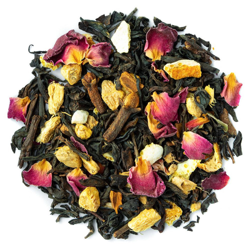 De Pu Erh Thee Taj Mahal is een exotische en kruidige mix geïnspireerd door de smaken van India. Deze mix bevat Pu Erh, een gefermenteerde Chinese thee rijk aan antioxidanten en bekend om zijn gezondheidsvoordelen, zwarte thee Lapsang Souchong, die een rokerige en houtachtige smaak aan de drank geeft. Gember en kaneel voegen een kruidige en troostrijke noot toe, sinaasappel- en citroenschillen brengen een vleugje citrus. Tot slot voegen kruidnagel en kardemom een kruidige en aromatische diepte toe, terwijl rozenblaadjes een delicate bloemige toets toevoegen. Over het algemeen is de Pu Erh Thee Taj Mahal een rijke en complexe mix, perfect voor degenen die van kruidige en houtachtige smaken houden.