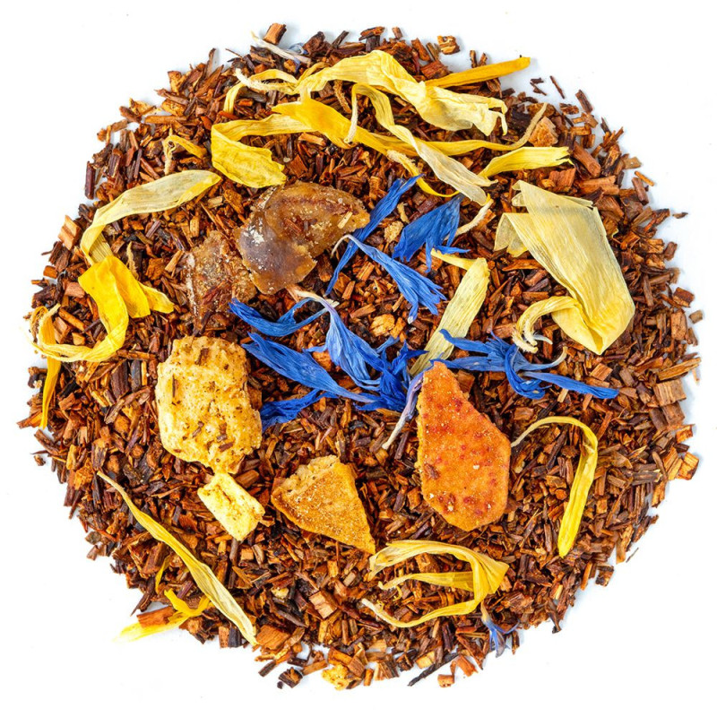 Abrikoos en perzik brengen zachtheid in het geheel. De bourbon vanille biedt zoete, lekkere toetsen die de smaakpapillen van jong en oud zullen bekoren. Ten slotte komen de korenbloemen en goudsbloemenbloemen het geheel sublimeren door hun aroma's vrij te geven. Genoten warm of ijskoud, garandeert deze rooibos u een zeer aangename ervaring.