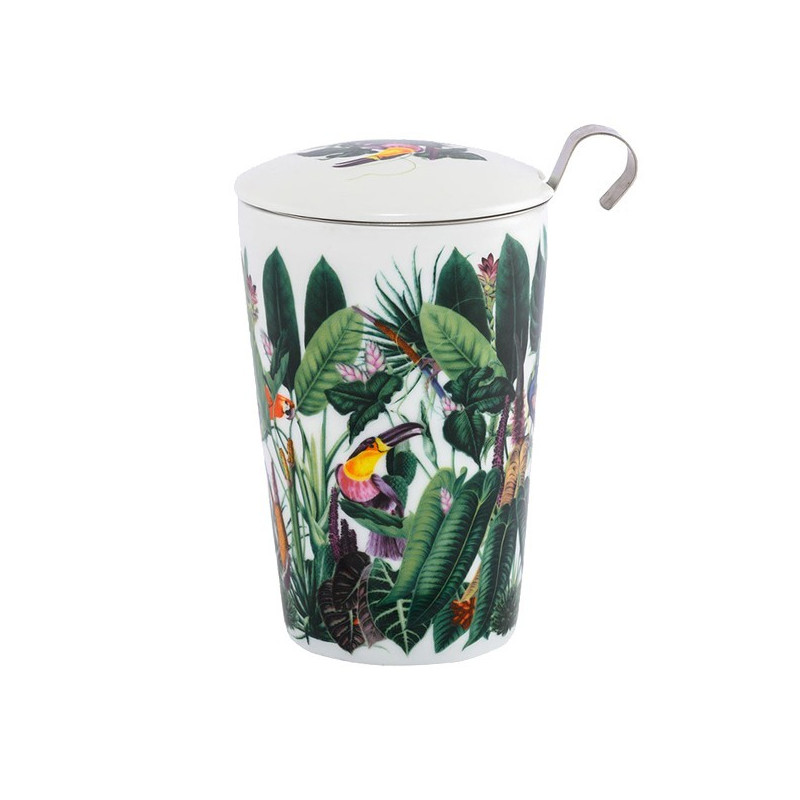 Deze porseleinen theepot van 35cl heeft een dubbele wand die de warmte van uw infusie behoudt en een geïntegreerd roestvrijstalen filter. De Rainforest kop dompelt u onder in het hart van het tropische regenwoud met zijn plantenmotieven en veelkleurige vogels.