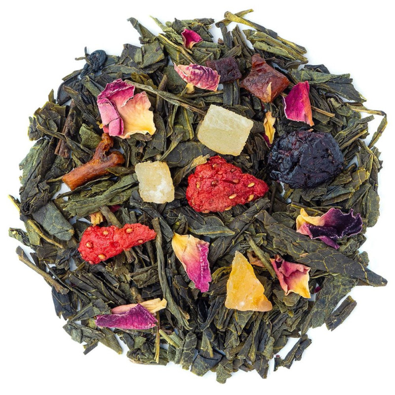 Un thé vert parfumé, gourmand et très agréable en bouche ! Ce mélange joyeux est composé d'une base de thé vert Sencha de Chine avec de la papaye, de la cerise, de la framboise ou encore de l'ananas. A savourer toute la journée.