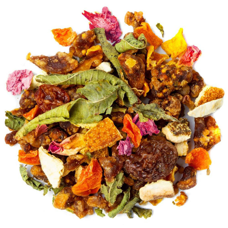 À chaque gorgée, le parfum doux et fruité de la figue se mêle à la rondeur sucrée de la datte et au moelleux du raisin. Cette infusion évoque les souvenirs d’un souk aux mille senteurs, d’un soir d’été aux portes du désert. parfaite pour une pause douceur.