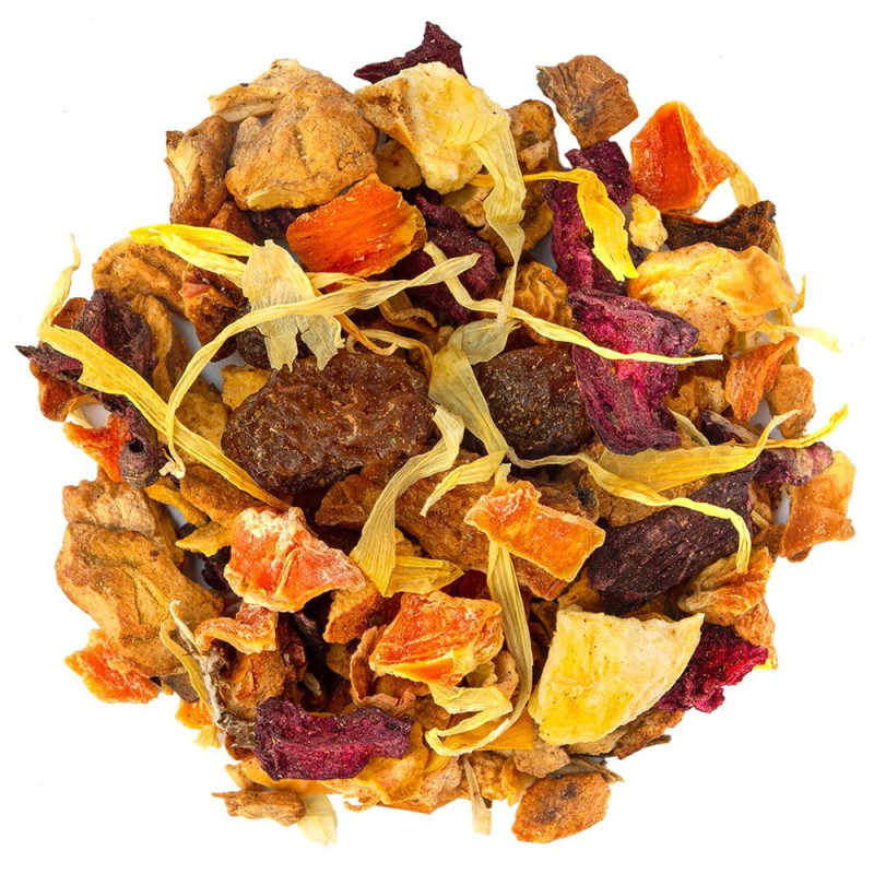 Une infusion aux arômes complexes dont les saveurs proviennent du mélange des fruits : coing, de pomme et de raisin, mais aussi de betterave rouge et de carotte ! Au niveau des plantes et des fleurs, on trouve de la passiflore (elle-même appelée fleur de la Passion !) et du souci (calendula officinalis) de la famille des astéracées. Pas de théine dans cette tisane : du fruit et encore du fruit, pour une boisson douce et juicy !